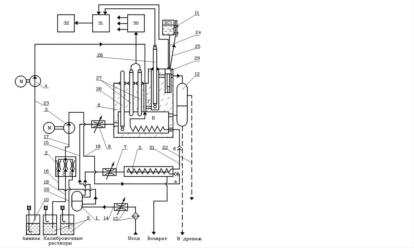 После ресивера 1 проба разделяется на три потока: часть пробы (2 л/час) поступает в теплообменник ячейки 6 и затем через ресиверы 12 сливаются в дренаж; другая часть пробы (0,8 л/час) через переключатель потоков 2 отбирается насосом 3 и по каналу, минуя теплообменник 5, подается в змеевик теплообменника ячейки 6, где приобретает температуру 40±0,3 оС, а затем, перемешиваясь с аммиаком, поступает в измерительную и вспомогательную (сравнительную) камеры ячейки 6 и через ресиверы 12 сливается в дренаж.