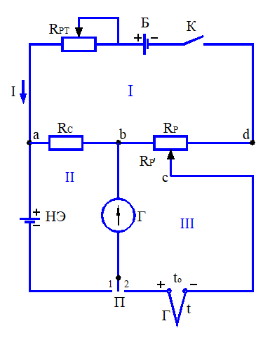 Прибор состоит из трех смежных электрических контуров. Контур I образует измерительную цепь, в которую включены: источник постоянного тока Б, переменный резистор (реостат) Rр.т. для измерения величины тока, сравнительный резистор Rс, уравновешивающий резистор (реохорд) Rр и кнопка К. Контур II представляет собой цепь нормального элемента НЭ, а контур III – цепь термоэлектрического термометра Т. В контуры II и III поочередно включается посредством переключателя П гальванометр Г.