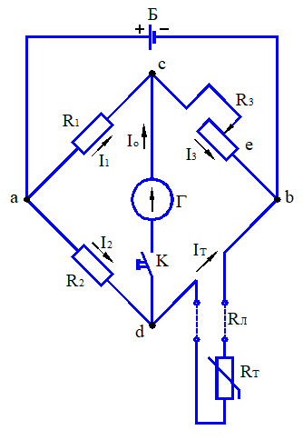 Два плеча моста R1 и R2 имеют постоянные и точно известные сопротивления. Третье плечо R3 состоит из градуированного переменного резистора (реохорда) и четвертое – из термометра сопротивления Rт и сопротивления 2 проводов соединительной линии Rл. В диагональ моста ab включен источник питания Б постоянного тока, а в диагональ cd – нулевой гальванометр Г и кнопка К.