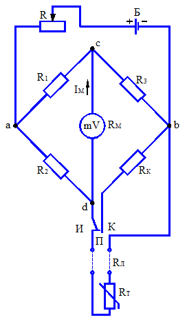 В три плеча моста включены постоянные резисторы R1¸R3, а четвертое – в зависимости от положения переключателя П-термометр сопротивления RT с соединительной линией RЛ (положение И) или контрольный резистор RК (положение К). К диагонали моста ab подключается источник постоянного тока Б и реостат R для установки рабочего тока, а к диагонали cd – милливольтметр mV с внутренним сопротивлением Rм.