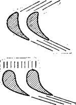 Усовершенствованные хорошо обтекаемые профили лопаток отличаются округленной входной кромкой (рис. 33.7). Это снижает вихревые потери на входе в канал. Кроме того, на переменных режимах работы турбины изменение направления потока газа гораздо меньше влияет на КПД. Характерным является также криволинейное очертание всей выпуклой поверхности профиля -и наличие возможно. тонкой, закругленной выходной кромки. Все это обеспечивает более благоприятное распределение давлений по профилю и связанное о этим уменьшение потерь.