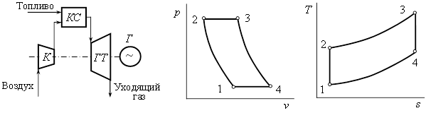 Цикл ГТУ с изобарным подводом теплоты, цикл, представленный на рисунке. Газотурбинная установка состоит из компрессора К, камеры сгорания КС и газовой турбины ГТ. Работа, производимая ГТУ, идет на привод электрогенера