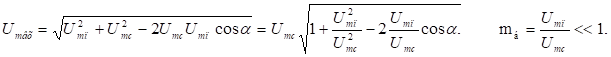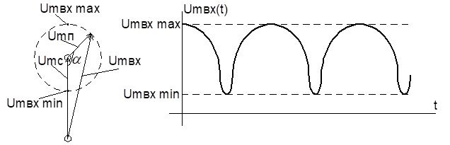 Проанализируем случай, когда помеха на вх. АД намного меньше уровня полезного сигнала. Рассмотрим простейшую ситуацию, когда и сигнал и помеха является гармоническими колебаниями: Uвх(t)=Umccoswct+Umпcoswпt. Umп<<Umc. Анализ проведем с использованием векторной диаграммы.