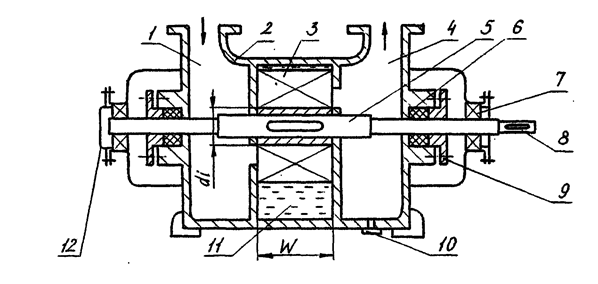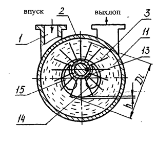 Как видно из схемы ось вращения импеллера эксцентрично закреплена относительно расточки корпуса насоса и вращающееся лопатки, погруженные концами в кольцо жидкости, образуют ряд последовательно движущихся (поворачивающихся) карманов, которые в области впускного патрубка увеличиваются в объеме, всасывая откачиваемый газ, а в области выпускного патрубка уменьшаются в объеме, сжимая газ до атмосферного давления и выбрасывая его в выпускной патрубок. Геометрическая быстрота откачки насоса: