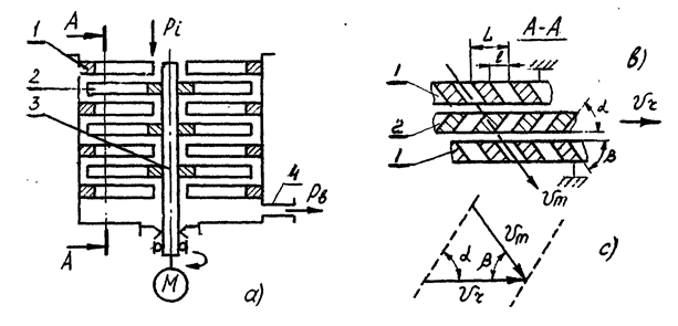 1 – диски статора с прорезями, наклоненными под углом  β к плоскости