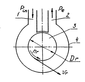 Необходимо рассчитать скорость вращения ротора простейшего молекулярного насоса, известного как насос Геде. Диаметр ротора насоса Dr = 0.4 м (рис. 4). На рис. 4 цифрами обозначены: