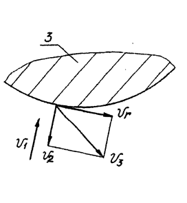 Принцип работы насоса основан на том, что молекулы, попавшие в пространство между корпусом (4) и ротором (3) сначала начинают двигаться в произвольном направлении. При ударе о вращающийся ротор, рис.5, молекулы отражаются, приобретая дополнительную тангенциальную составляющую Vr в направлении вращения ротора. Тогда суммарная (средняя) скорость отраженных молекул :