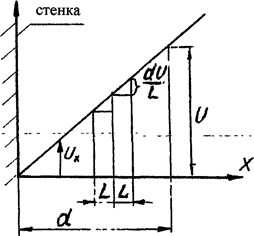 Изучение течения потока газа через отверстия показывает, что скорость потока постепенно убывает от центра к периферии, пока не достигает величины равной нулю у стенки отверстия. Каждый слой газа, параллельный направлению потока создает тангенциальную силу, действующую на соседние слои, уменьшающую скорость более быстрых слоёв или увеличивающий скорость более медленных слоёв. Это свойство газа (или жидкости) известно под названием внутреннего трения (вязкости) и схематично показано на рис.11, где показана функция распределения скоростей слоёв газа, начиная от стенки. Обозначим символом n скорость потока в центре струи, на расстоянии d от неподвижной стенки. Тогда отношение V/d есть градиент скорости.