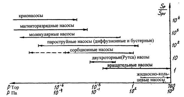 Таким образом, если мы хотим согласовать быстроту действия , например, пароструйного диффузионного насоса, работающего при давлении Pн=10-3Па, последовательно соединённого с форвакуумным имеющим параметры Рф=102 Па, Sф=10-4м3с-1, то быстрота действия «согласованного» диффузионного насоса составит: