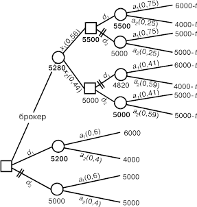 Рассмотрение начнем с левого края рисунка, т.е. от ствола дерева. Начальная стадия состоит в том, что бизнесмен должен выполнить одно из трех действий, изображенных тремя ветвями. Первая ветвь имеет обозначение “брокер” и соответствует обращению к брокеру и оплату его консультации. Вторая ветвь (d1) означает решение инвестировать без совета брокера, а третья (d2) — решение оставить деньги в банке.