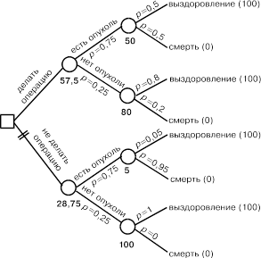 Проведенный анализ позволяет дать количественную оценку снижения риска для решения “делать операцию”. Она представляет собой отношение чисел 57,5 и 28,75. Поделив первое на второе, получим 2, т.е. в данном случае операция снижает риск летального исхода в два раза. Теперь должно быть понятно, почему не имела значения абсолютная величина показателя ценности последствий решения — она сокращается при делении первой величины на вторую. Так, если условное значение 100 заменить, например, на 10, то вместо величин 57,5 и 28,75 получатся соответственно 5,75 и 2,875, но их отношение, очевидно, не изменится.
