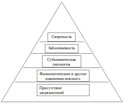 Для экологической эпидемиологии характерен популяционный уровень изучения биологических ответов на воздействие загрязненной окружающей среды. Их схематический спектр представлен на рисунке. Острие пирамиды указывает на наиболее тяжелые поражения, заканчивающиеся смертью или развитием заболевания. Количество населения, ответившего такими поражениями, значительно меньше, чем число людей с субклиническими проявлениями.