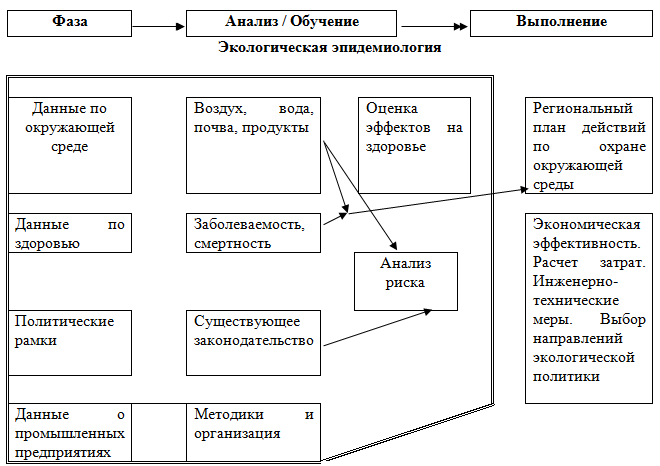 С 1996 года в России реализуется крупный международный подпроект по экологической эпидемиологии в рамках Всемирного банка «Проект по управлению качеством окружающей среды». Задачей этого проекта является совершенствование системы о состоянии окружающей среды и здоровья населения России. Рисунок 2 иллюстрирует главные этапы работ по этому проекту.