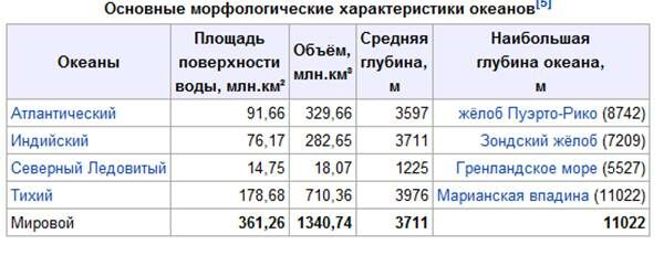 Она образует ее прерывистую водную оболочку. Средняя глубина океана составляет 3800 м, максимальная (Марианская впадина Тихого океана) — 11,034 метров. Около 97 % массы гидросферы составляют соленые океанические воды, 2,2 % — воды ледников, остальная часть приходится на подземные, озерные и речные пресные воды. Общий объём воды на планете около 1532000000 кубических километров. Масса гидросферы примерно 1,46*1021 кг. Это в 275 раз больше массы атмосферы, но лишь 1/4000 от массы всей планеты. Гидросферу на 94% составляют воды Мирового океана, в которых растворены соли (в среднем 3,5%), а также ряд газов. Верхний слой океана содержит 140 трлн тонн углекислого газа, а растворенного кислорода - 8 трлн тонн. Область биосферы в гидросфере представлена во всей ее толще, однако наибольшая плотность живого вещества приходится на поверхностные прогреваемые и освещаемые лучами солнца слои, а также прибрежные зоны.