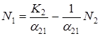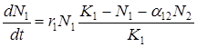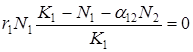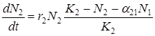 Аналогично, нетрудно вывести и формулы, связывающие численности двух конкурирующих популяций с предельной численностью 2-й популяции и влиянием нашего вида на вид-конкурент: