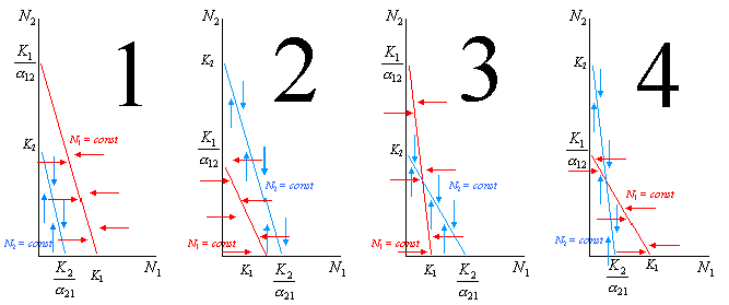 Рассмотрим эти 4 варианта более подробно. На рисунке 1 выполняются следующие условия: K2 / a12 < K1 (то есть вид 1 может сдерживать вид 2) и K1 / a21 > K2 (то есть вид 2 не может сдерживать вид 1). В этой ситуации первый вид может наращивать численность и тогда, когда численность 2-го вида достигла максимума (K2), его влияние на конкурента становится всё сильнее. В итоге вид 1 неминуемо вытесняет своего конкурента. 2-й случай – строго противоположный: K2 / a12 > K1 (то есть вид 1 не может сдерживать вид 2) и K1 / a21 < K2 (то есть вид 2 может сдерживать вид 1). В этой ситуации 1-й вид сам будет вытеснен. Случай 3 отражает ситуацию неустойчивого равновесия, когда оба вида не могут сдерживать численность друг друга (K2 / a12 > K1 и K1 / a21 > K2). При определенных значениях численностей (соответствуют точке пересечения двух прямых) обоих конкурентов эти численности могут стабилизироваться, но после малейшего увеличения ставший более многочисленным вид неминуемо вытеснит конкурента. Наконец, в случае 4 (K2 / a12 < K1 и K1 / a21 < K2) ни один вид не может достичь такой численности, которая соответствовала бы полному отсутствию вида-конкурента, – это устойчивое равновесие.