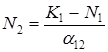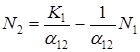 Это же выражение можно представить и как зависимость численности вида-конкурента от численности нашего вида: a12N2 = K1 – N1, или