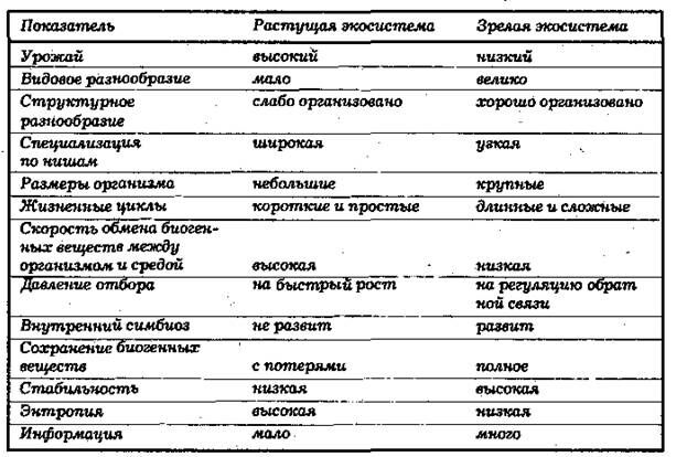 Одним из главных достижений экологии стало открытие, что развиваются не только организмы и виды, но и экосистемы. Последовательность сообществ, сменяющих друг друга в данном районе, называется сукцессией. Сукцессия происходит в результате изменения физической среды под действием сообщества, т. е. контролируется им. Замещение видов в экосистемах вызывается тем, что популяции, стремясь модифицировать окружающую среду, создают условия, благоприятные для других популяций. Это продолжается до тех пор, пока не будет достигнуто равновесие между биотическими и абиотическими компонентами. Развитие экосистем во многом аналогично - развитию отдельного организма и в то же время сходно с развитием биосферы в целом. Сукцессия в энергетическом смысле связана с фундаментальным сдвигом потока энергии в сторону увеличения количества энергии, направленной на поддержание системы. Сукцессия состоит из стадий роста, стабилизации и климакса. Их можно различать на основе критерия продуктивности: на первой стадии продукция растет до максимума, на второй остается постоянной, на третьей уменьшается до нуля по мере деградации системы. Наиболее интересно различие между растущими и зрелыми системами (Таблица).