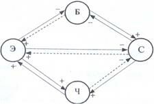 Видимое благополучие человечества обусловлено двумя положительными связями: Э"+Ч и Ч+!С, причем сами люди отдают явное предпочтение первой из них - получению произведенных ценностей. Поскольку число людей Ч и их потребности растут, то увеличивается и продукция экономики Э. Это увеличение до сих пор происходит намного быстрее, чем растет коэффициент полезного действия экономики, т.е. отношение количества произведен