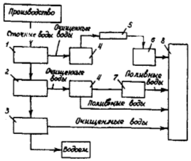 1 - сооружения механической очистки; 2 - сооружения физико-химической очистки; 3 - сооружения биохимической очистки; 4 - пруды-ило-уплотнители или биологические пруды; 5 - отводной канал; 6 - пруд-испаритель; 7 - поля фильтрации; 8 - земледельческие поля орошения