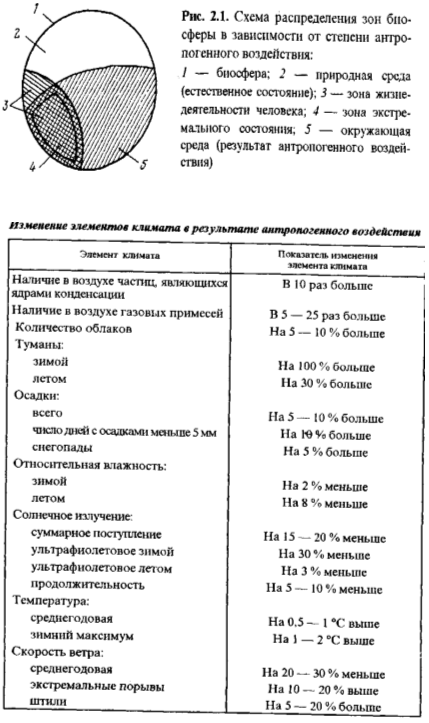 Уже сейчас в районах с развитой промышленностью наблюдаются, по данным В.А. Ковды, существенные изменения элементов климата по сравнению с естественными условиями (табл.2.1).