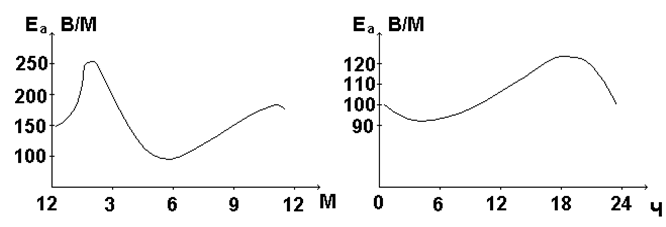 Величина Еа испытывает периодические годовые и суточные изменения. Годовые изменения имеют сходный характер по всему Земному шару с максимумом в декабре – феврале и минимумом в мае – июле. На суточное изменение большое влияние оказывает грозовая деятельность.