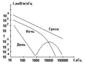 Атмосфериками называют ЭМП, создаваемые атмосферными разрядами, в частности молниями. Их частотный диапазон от сотен герц до десятков мегагерц, при этом интенсивность достигает максимума вблизи 10 кГц и убывает по мере возрастания частоты. В районах, близких к местам грозовых разрядов, напряженность электрической составляющей ЭМП атмосфериков – порядка десятков, сотен и даже тысяч В/м на частотах, близких к 10 кГц.