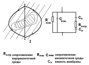 Каждая клетка окружена мембраной, обладающей поверхностной емкостью в пределах 0.1÷0.3 мкФ/см2 и поверхностным сопротивлением до 10 кОм×см2. Межклеточная и внутриклеточная среды имеют сопротивления порядка 100÷300 Ом×см2 и диэлектрическую проницаемость около 80.