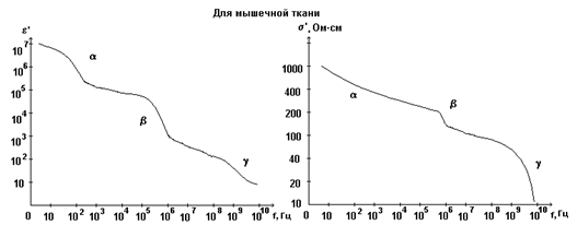 Имеются три частотных диапазона, в которых наблюдается изменение e’ и s’ (или r = 1/s или e’’) тканей в зависимости от частоты: a-дисперсия при низких частотах, b-дисперсия при радиочастотах и g-дисперсия при сверхвысоких частотах.