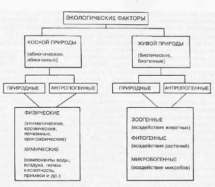 Экологические факторы очень многообразны как по своей природе, так и по воздействию на живые организмы. Условно все факторы среды подразделяются на три основные группы – абиотические, биотические и антропогенные.