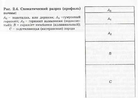 В результате перемещения и превращения веществ почва обычно расчленяется на отдельные слои, или горизонты, сочетание которых на разрезе образует профиль почвы (рис. 2), который в общем виде выглядит следующим образом: