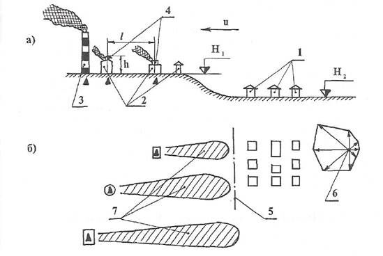 1 – жилая застройка; 2 – цеха предприятия; 3 – точечный высокий источник (дымовая труба); 4 – линейные источники (аэрационные фонари); 5 – граница населенного пункта; 6 – средняя роза ветров теплого периода года; 7 – факелы выбросов загрязняющих веществ при направлении ветра в сторону жилой застройки
