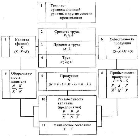 Сопоставление показателей объема продукции и себестоимости характеризует величину прибыли и рентабельность продукции (блок 8), а также затраты на 1 руб. продукции. Сопоставление показателей объема продукции и величины авансированных основных и оборотных средств характеризует воспроизводство и оборачиваемость капитала (блок 9), т.е.  фондоотдачу основных производственных фондов и об орачиваемость оборотных средств. Полученные показатели в свою очередь в совокупности определяют уровень рентабельности хозяйственной деятельности (блок 10). Уровень общей рентабельности в числителе формулы отражает не только прибыль от реализации продукции, но и другие финансовые результаты.
