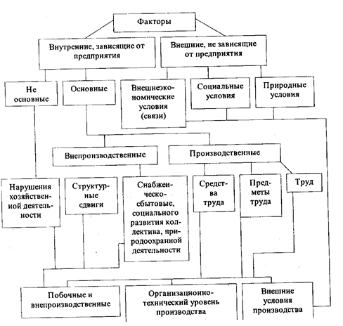 Исходя из задач анализа эффективности деятельности, большое значение имеет классификация факторов (рис. 2.2), деление их на внутренние (которые, в свою очередь, подразделяются на основные и неосновные) и внешние. Внутренними основными называются факторы, определяющие результаты работы предприятия. Внутренние неосновные факторы, хотя и определяют работу производственного коллектива, но не связаны непосредственно с сущностью рассматриваемого показателя: это структурные сдвиги в составе продукции, нарушения хозяйственной и технологической дисциплины. Внешние факторы не зависят от деятельности производственного коллектива, но количественно определяют уровень использования производственных и финансовых ресурсов данного предприятия. Здесь надо заметить, что, например, социальные факторы могут быть зависимы и от деятельности производственного коллектива, поскольку они входят в орбиту планирования социального развития предприятия. То же касается природных и внешнеэкономических условий.