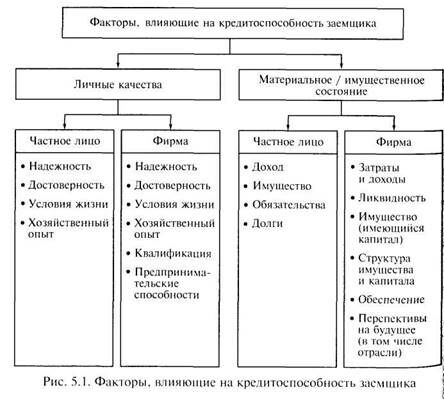 Кредитный риск — это потенциальные потери, возникающие при невозврате или несвоевременном возврате клиентами-заем­щиками сумм задолженностей банкам. Прогнозирование риска заключающееся, например, в оценке кредитоспособности, включает такие моменты, как проверку юридической правоспособно­сти клиента, его финансового положения, кредитной истории и качества предложенного им обеспечения. Факторы, влияющие на кредитоспособность заемщика приведены на рис. 5.1. Целями кредитной политики являются: