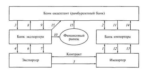 1 — импортер поручает своему банку получить согласие первоклассного банка (банка-акцептанта) акцептовать тратту (с приложением товарораспорядительных документов в соответствии с условиями аккредитива), которая будет выставлена на него экспортером; 2— банк импортера и банк-акцептант заключают соглашение, в соответствии с которым последний акцептует тратту, а первый берет на себя обязательство своевременно перевести средства для ее оплаты; 3 — банк-акцептант открывает в банке экспортера аккредитив, содержащий обязательство акцепта тратты, выставляемой экспортером на банк-акцептант; 4 — банк экспортера извещает экспортера об открытии аккредитива; 5 — экспортер отгружает товар; 6 — экспортер предъявляет тратту (вместе с товарораспорядительными документами) своему банку; 7— банк экспортера может учесть тратту, выставленную экспортером; 8 — банк экспортера направляет тратту (вместе с товарораспорядительными документами) банку-акцептанту для акцепта; 9 — банк-акцептант возвращает банку экспортера акцептованную тратту; 10 — банк экспортера может переучесть тратту на финансовом рынке; 11— банк-акцептант отсылает товарораспорядительные документы банку импортера; 12 — банк импортера перелает товарораспорядительные документы импортеру против предоставления импортером обеспечения; 13 — банк импортера в соответствующие сроки проводит списание суммы тратты со счета импортера и возвращает ему предоставленное им ранее обеспечение; 14 — банк импортера переводит средства банку-акцептанту для погашения тратты; 15 — последний держатель тратты при наступлении срока платежа предъявляет ее банку-акцептанту для оплаты