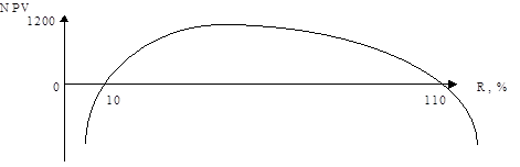 Необходимо отметить, что не для любого денежного потока имеется возможность однозначного определения показателя внутренней рентабельности проекта. В частности, для денежного потока, представленного в табл. , как это видно на рис. 2.8, этот денежный поток имеет две различные процентные ставки, при которых чистая текущая стоимость NPV равна нулю. Следовательно, этот поток характеризуется двумя различными значениями IRR, которые равны 9.8% и 111.5% .