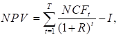 где CIFt - поступления денежных средств на окончание интервала t, образующие входной денежный поток; CОFt - платежи денежных средств на окончание интервала t, образующие выходной денежный поток; Т - количество процентных интервалов в инвестиционном периоде; R - ставка дисконтирования, принятая для оценки инвестиционного проекта.
