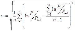 Первый прием представляет собой не что иное, как начисление процента за базовый период времени, равный 1 (через определенные равные промежутки времени); второй -непрерывное начисление процента. Результаты, получаемые с использованием первого или второго способов, не сильно отличаются друг от друга. Но: в предположении, что стохастический процесс динамики цен является стационарным и что последовательные изменения цен взаимно независимы, цены активов, которыми торгуют на конкурентных рынках, должны подчиняться логнормальному распределению; поэтому относительный доход должен иметь логнормальное распределение, эффективная доходность за базовый период также должна иметь логнормальное распределение со сдвигом влево на единицу, а доходность за базовый период при непрерывном начислении процентов должна иметь нормальное распределение. Поскольку параметры логнормального распределения в силу его асимметричности сложно использовать для статистических оценок, мы в дальнейшем будем использовать непрерывное начисление процента (с целью использования для работы нормального распределения!), поэтому волатильность - это выборочное стандартное отклонение логарифма отношения последней цены к цене предыдущей, выраженное в процентах годовых (стандартное отклонение непрерывной ставки процента):