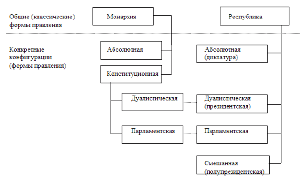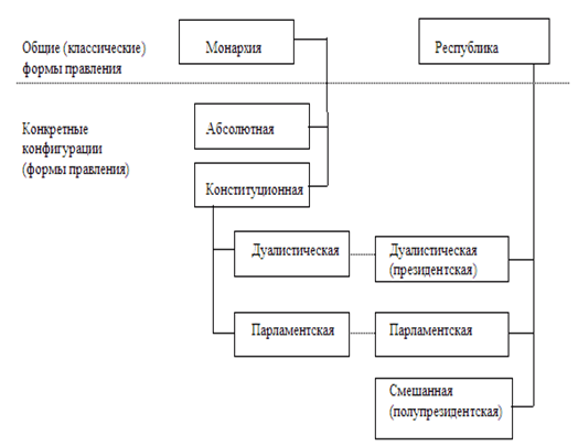 Второй подход детализирует первый. Среди монархических форм правления (= в рамках монархической формы правления) выделяют абсолютную и конституционную монархии; последняя распадается на дуалистические и парламентские монархии. Республиканская форма правления существует в виде президентских (дуалистических), парламентских и полупрезидентских (смешанных) республик. С учетом того, что парламентские республики и парламентские монархии обнаруживают больше сходства, чем различия, а у дуалистических монархий и республик также много общего, мы получаем следующую схему: