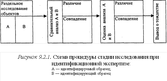 В том случае, если несовместимые свойства сравниваемых объектов отсутствуют, переходят к оценке обнаруженных совпадений. Оценивая их, необходимо определить, является ли установленная совокупность совпадений индивидуальной для объектов или указывает лишь на их сходство (однородность). Если совокупность совпадений индивидуальна, т. е. неповторима в других объектах, то констатируют тождество объектов идентифицируемого и идентифицирующего и делают положительный вывод. Таким образом, процедуру проведения стадии исследования идентификационной экспертизы можно представить в виде следующей схемы (рис. 9.2.1).