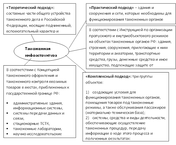 В периодических изданиях, нормативных документах по таможенной деятельности, в программах развития таможенной службы нередко используется словосочетание «таможенная инфраструктура». Говорят и пишут о «создании современной таможенной инфраструктуры», о качественном изменении подхода к «развитию таможенной инфраструктуры». В региональных таможенных управлениях есть отделы эксплуатации объектов таможенной инфраструктуры, в таможнях – подразделения капитального строительства и эксплуатации объектов таможенной инфраструктуры. Однако сущность понятий «таможенная инфраструктура», «объект таможенной инфраструктуры», которая раскрывается в учебной литературе и в нормативно-правовых документах, существенно различается.