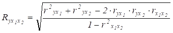 Показателем тесноты связи, устанавливаемой между результативными и двумя или более факторными признаками, является совокупный коэффициент множественной корреляции Ryx1x2. В случае линейной двухфакторной связи совокупный коэффициент множественной корреляции может быть рассчитан по формуле: