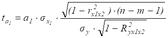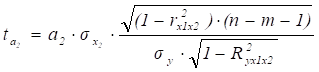 Для оценки значимости коэффициентов регрессии (а1…i) при линейной зависимости у от двух факторов (х1 и х2) используют t-критерий Стьюдента при n-m-1 степенях свободы: