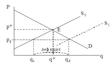 Но пониженная цена быстро отбивает охоту у производителей продавать данный товар, в результате чего величина его предложения сокращается с q* до qs. Величина же спроса, напротив, растет с q* до qd. Образуется дефицит (qd - qs) как первый итог правительственной политики: