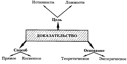 Под доказательством в формальной логике понимается обо­снование истинности одной мысли с помощью других. Формаль­ная логика предлагает универсальную структуру доказательства. Она состоит из тезиса, оснований доказательства (аргументов) и способа доказательства (демонстрации). Существуют различные виды дока­зательства. В зависимости от его целей выделяют доказательства истинности и ложности (опровержение); в зависимости от способа доказательства — прямые и косвенные; в зависимости от оснований доказательства — теоретические и эмпирические (см. рис. 1.5).
