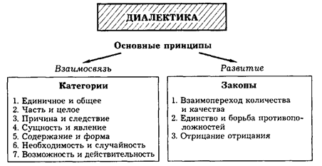 Диалектика — это нау­ка о наиболее общих законах развития при­роды, общества и человеческого мышления. Она является целост­ным методом, органической системой категорий и законов. Основ­ными принципами систематизации понятий стали принципы взаи­мосвязи и развития (см. рис. 1.7).