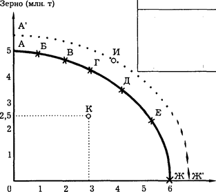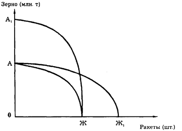 Из таблицы видно, что всякое увеличение производства ракет (с 0 до 6 штук) снижает производ­ство зерна (с 5 млн. до     0 т), и наоборот.