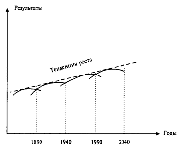 Таким образом, в основе длинных циклов по Кондратьеву лежит смена пассивной части основного капитала, т.е. зданий, сооружений и прочей инфраструктуры, обеспечивающей процесс производства: иначе говоря, индустрия в начале каждого длинного цикла коренным образом меняет свое лицо. Примечательно, что периодизация длинных волн по Кондратьеву (рисунок 1.7) практически совпадает с периодами доминирования технологических укладов.