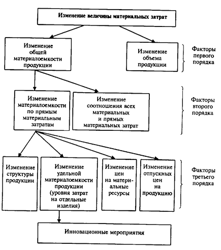 Каждый фактор второго порядка изменяется в свою очередь под влиянием изменения структуры продукции, изменения уровня затрат, цен на материальные ресурсы, отпускных цен на продукцию, которые являются по отношению к величине материальных затрат для аддитивного типа факторной системы факторами третьего порядка (рисунок 7.2).